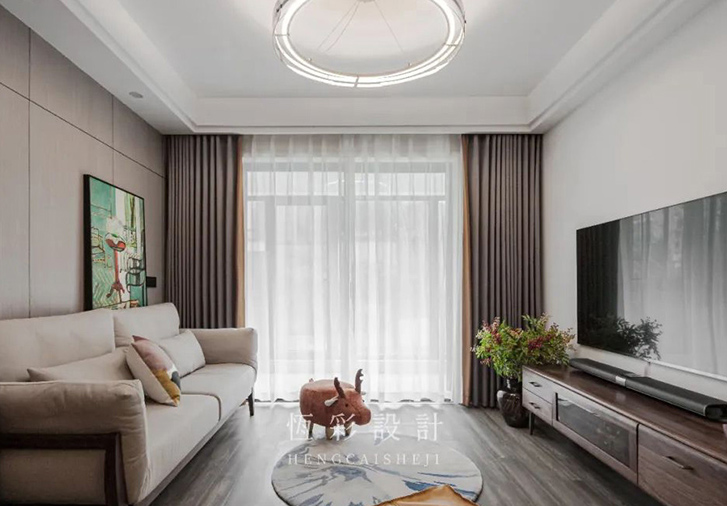 客厅户型方正,整面木饰面板装饰沙发背景墙,原木家具搭配米色布艺沙发,文艺淡雅。