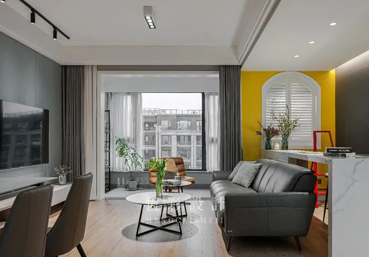 吧台靠阳台墙面局部刷成亮黄色,白色拱形木质百叶小窗装饰,美观个性。吧台黑色乳胶漆背景,吧台区域顶面石膏板下吊300mm,与墙面形成一个错位,配合灯带设计,极具艺术美感。