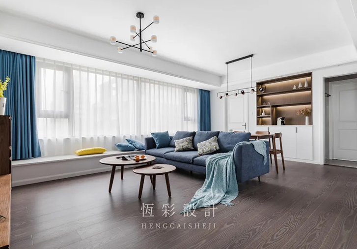 蓝色布艺沙发、窗帘,与之交融的白纱、原木家具,让人看到一种清新寡淡、不加言语的生活状态