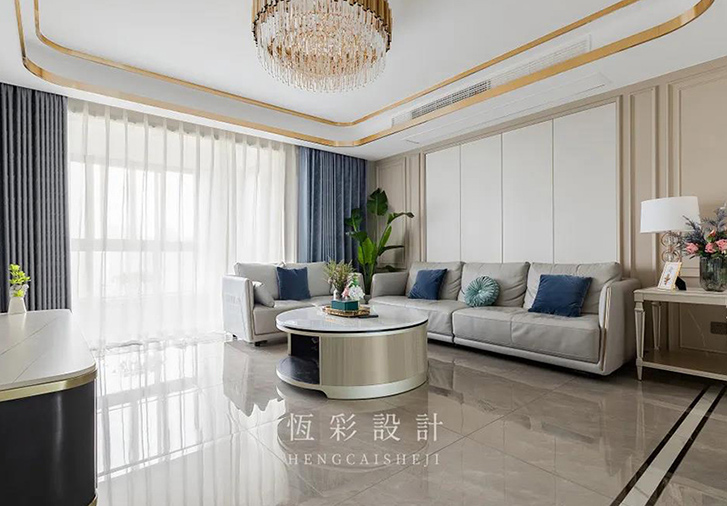 家具选择上以简约轻奢为主,造型简单的中性色家居,搭配整个硬装配色,稳!