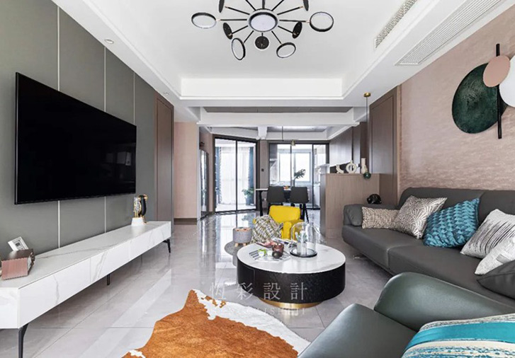 电视机背景墙则做了灰色的硬包,配合木饰的温润,品质感更加凸出。