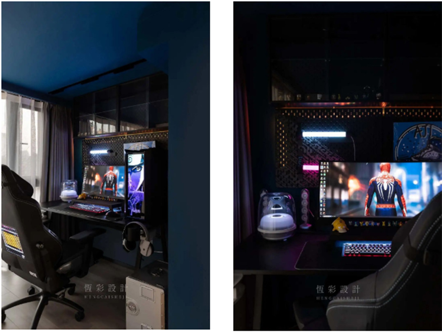 独立的工作游戏区应该是每个男生的梦想,主卧的阳台便做了这样的设计。依旧是孔雀蓝的色调,搭配黑色的电脑、桌椅,蓝黑的配合与厨房相呼应,起到点睛效果。