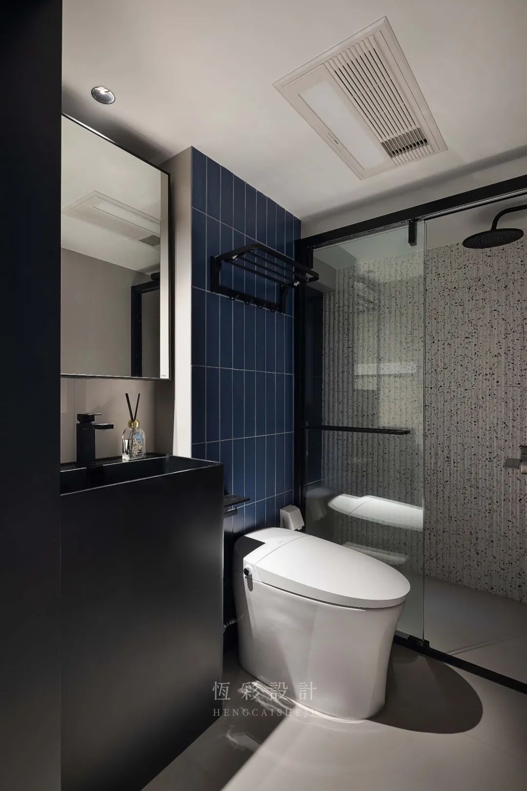蓝调的墙砖、水磨石纹理都为面积不算大的卫浴空间的颜值加分。