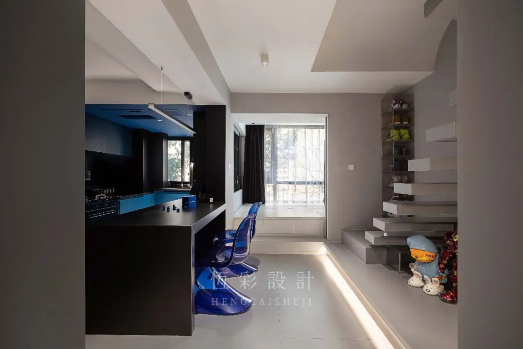 最初设计师是想把厨房做成一整个蓝色,安静又沉稳,但是因为地砖比较难找所以无奈放弃了,于是便有了当下蓝、黑的配色。