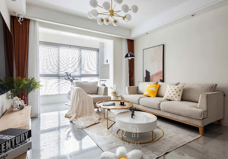 客厅整体是非常淡雅的基调,选择浅暖色的乳胶漆、高反光的地砖,提亮了整个空间。