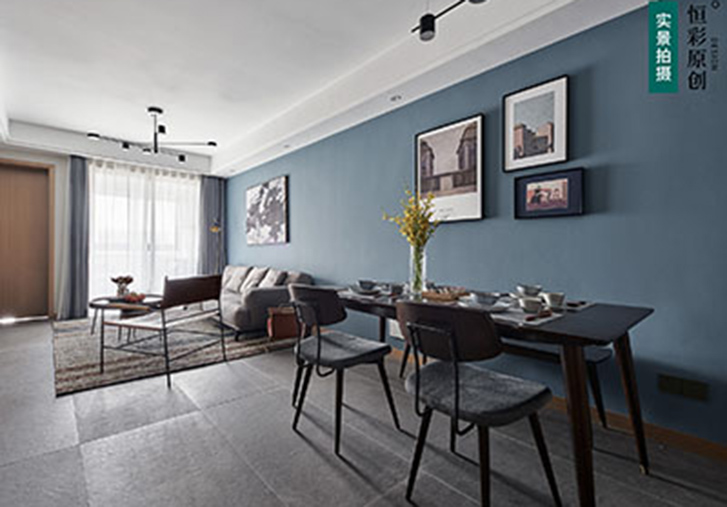 首先从配色上来看,客厅沙发背景墙灰蓝色乳胶漆,在蓝色基础上加上灰色调出雾感,犹如灰色滤镜一般,给整个墙面蒙上高级感。浅灰色雾面地砖恰到好处地平衡了空间配色,完美打造低调又高级的质感