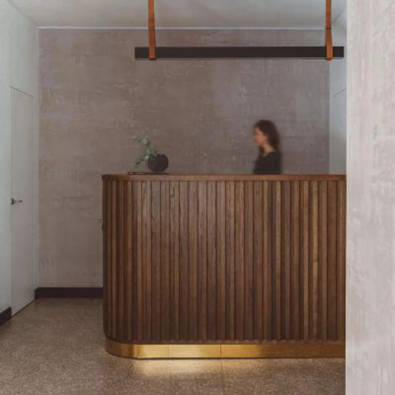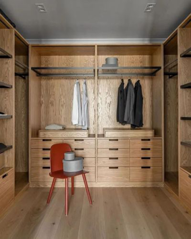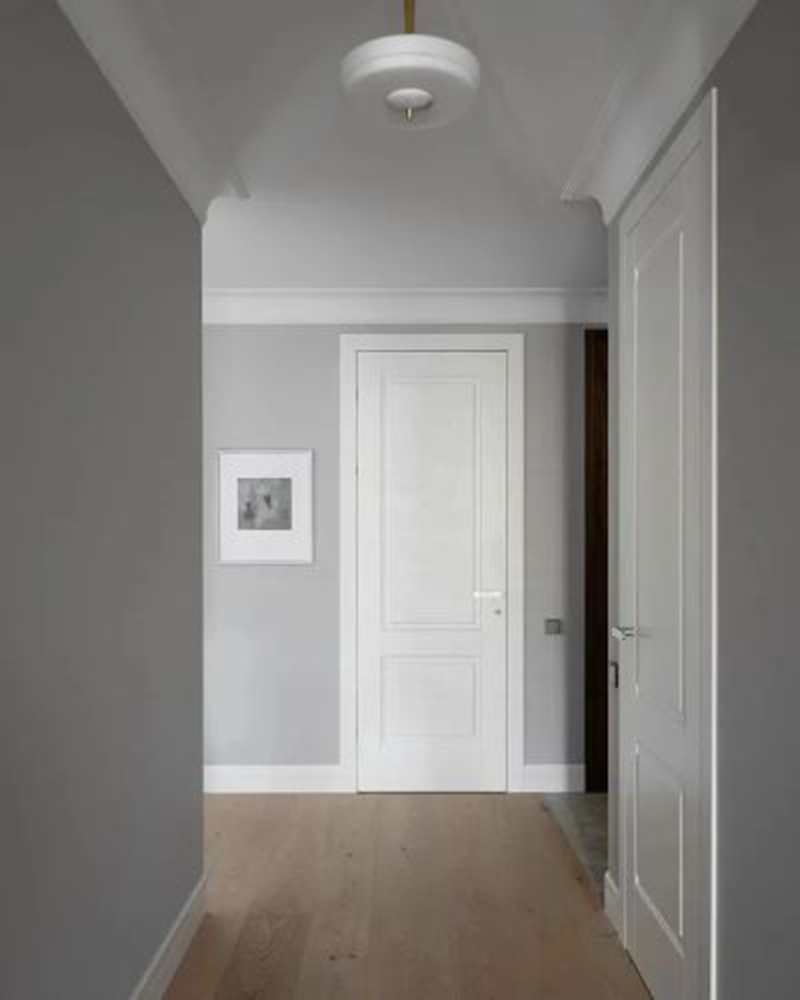 公寓整体大面积的冷色调,整体追求干净纯粹的极简风格。书房则选用了暖调的胡桃木让空间呈现的更加生动立体。
