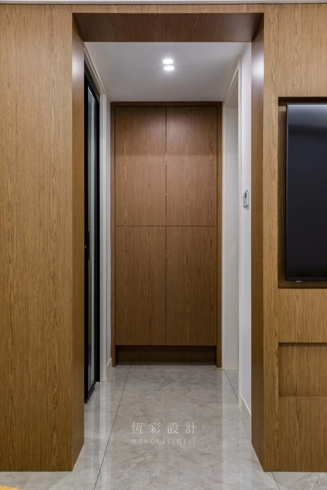 进门靠墙设计玄关柜,木饰面作为统一元素,增添一份归家的温馨感,整体美观性顿显。因为空间仅2㎡,至顶的设计最能满足收纳,底部抬高放置常穿的鞋物,实用兼具。