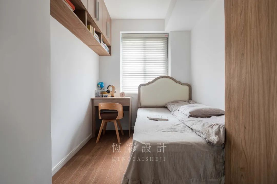放弃了凌乱的柜体布局,保留基本的休息+学习+储物功能,尽显整洁。