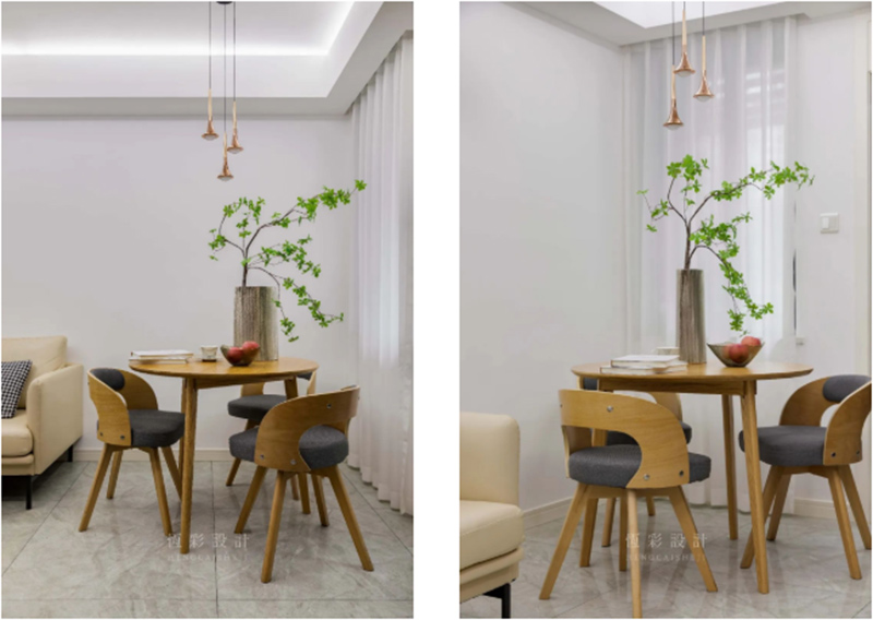 靠墙沙发、圆桌,简单的布置提高客餐厅的实用性。墙面未作过多的装饰,全部留白后空间采光瞬时提高。