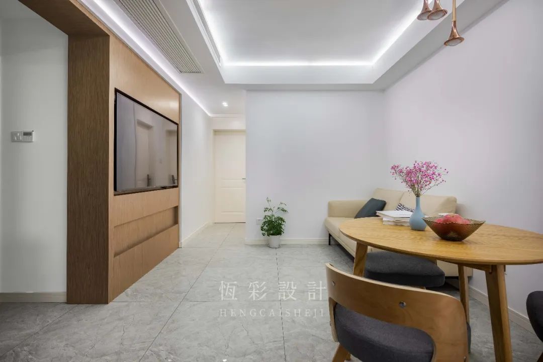 通过留白增加光感,软装布置简洁,空间感顿生。同时因为入户门的变化,客餐厅更为整体。