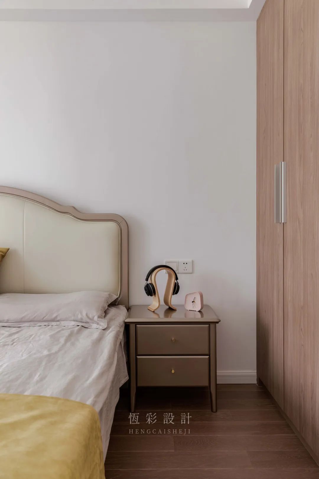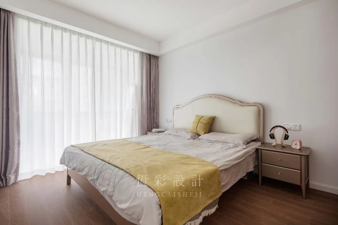 细看床头柜,造型色彩是有不同的,这种差别令其承担实用性的同时也增添了看点。
