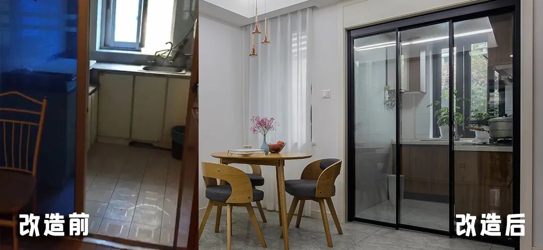 冰箱外移,门洞加宽,选择玻璃移门形成空间延伸感,视觉显大。
