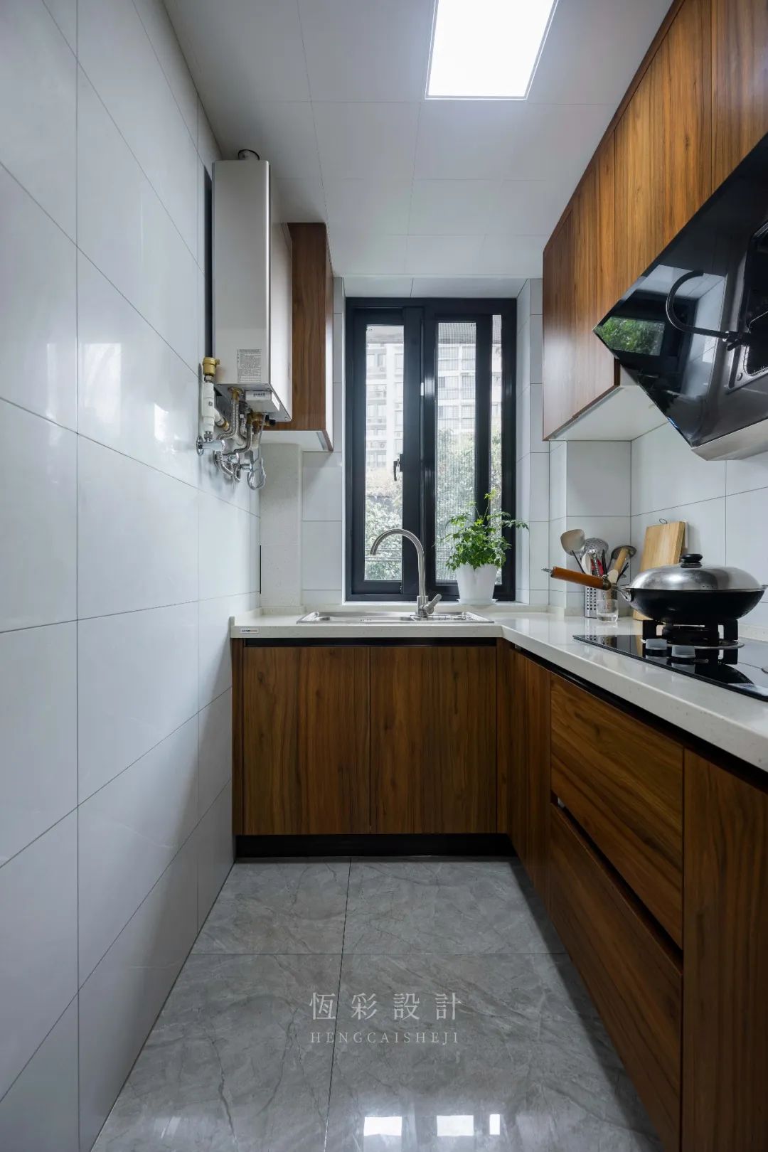 利用纵深空间,设计“L”型台面,提高可操作性优化生活动线。吊柜与下柜的配合,提高收纳能力也保证空间感。
