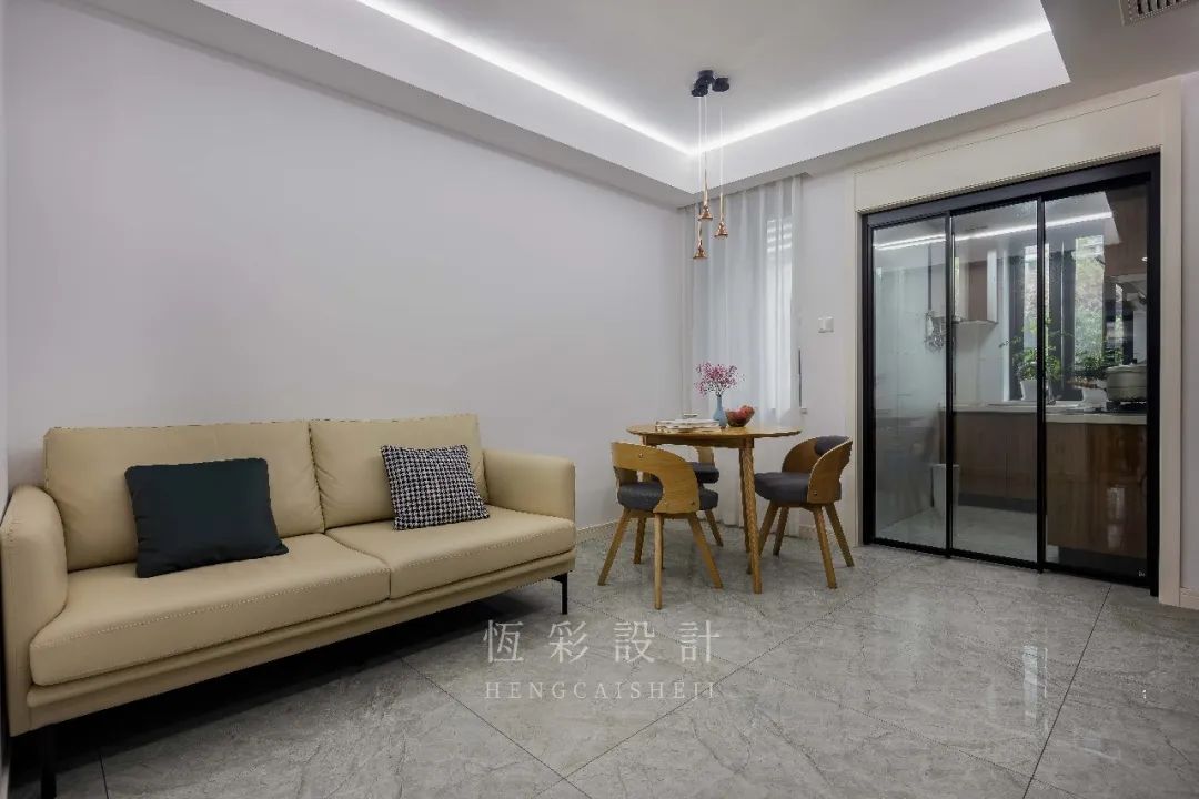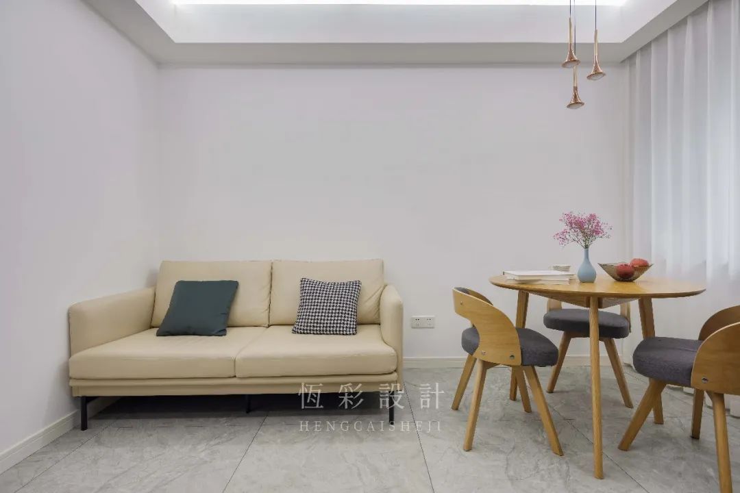 留白提升光感,阳台与客厅保留联通,增加空间的延伸性,落地窗帘做软隔断,起到一定的空间分割效果。