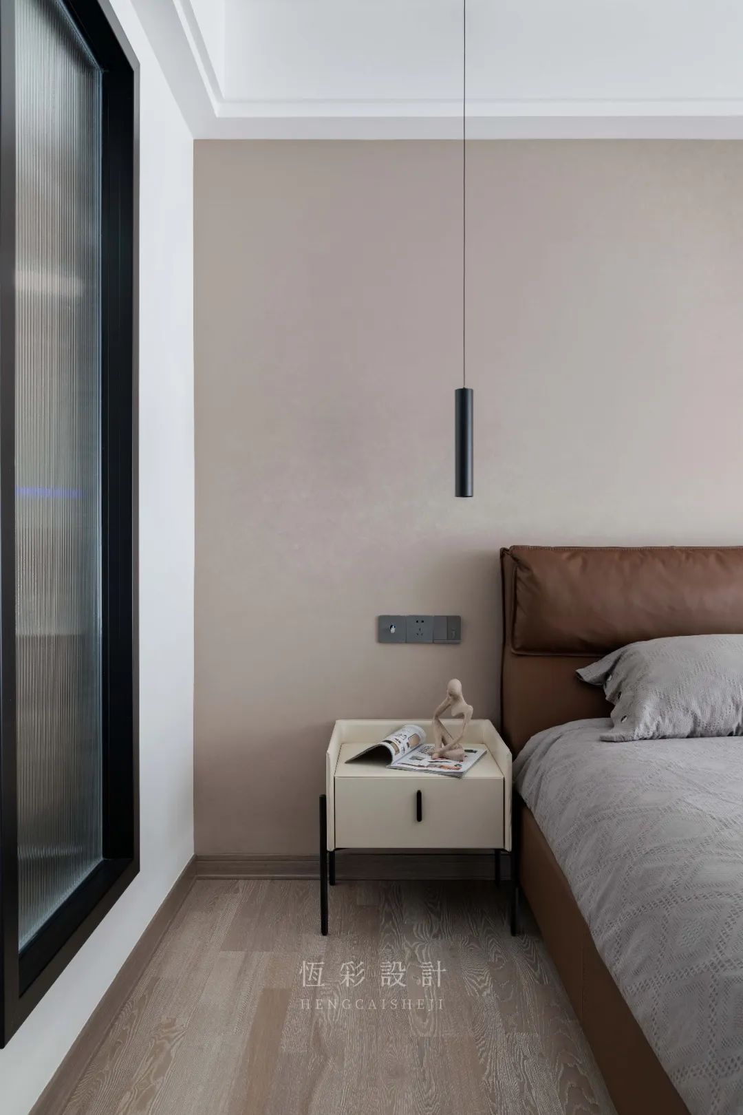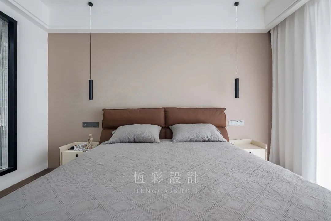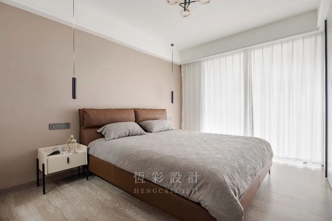 主卧整体是浅暖的调性,单墙乳胶漆铺刷提升整体的温馨度。棕色皮质床铺凸显质感,增加舒适度,简单的色彩搭配点明了极简的格调。
