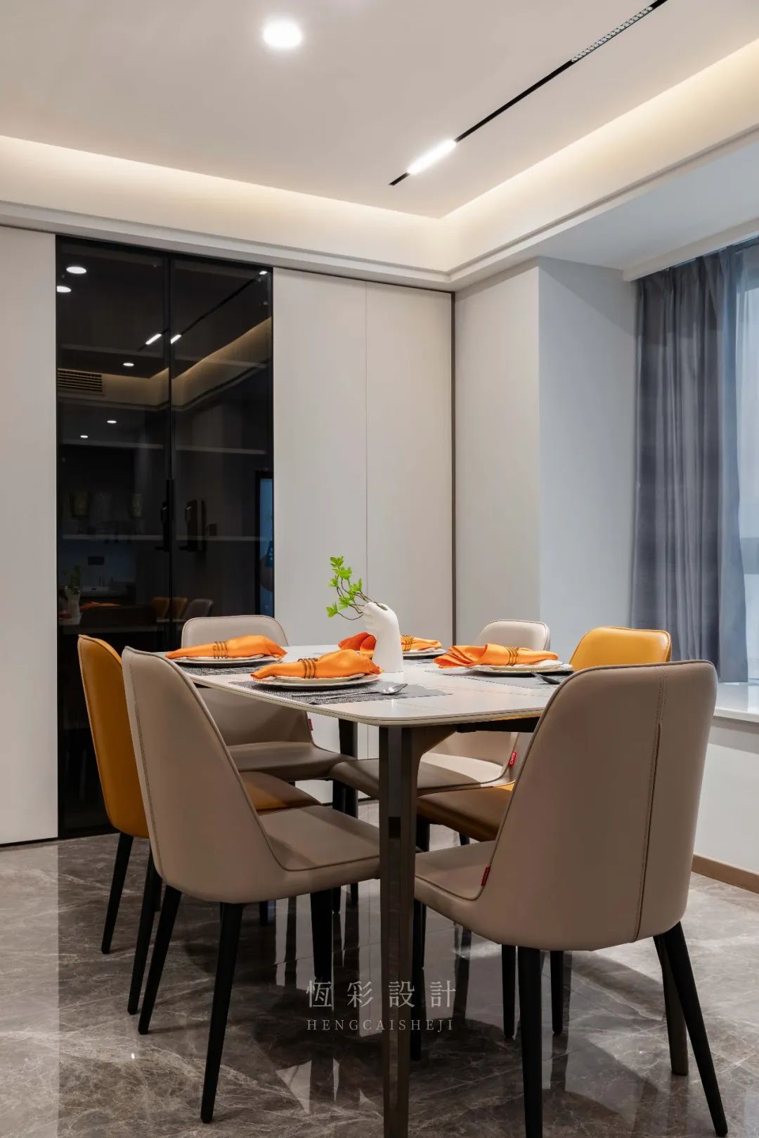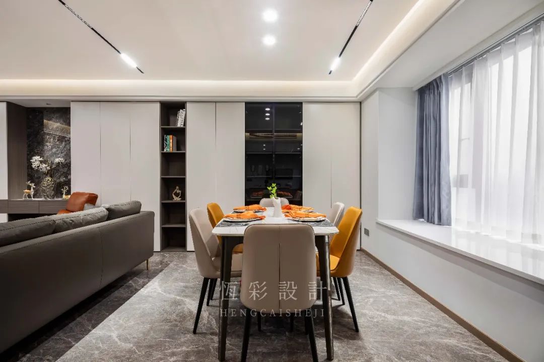 轻薄的岩板餐桌,大理石台面自带纹理,细腻、自然。搭配撞色餐椅,空间瞬间灵动有趣起来。