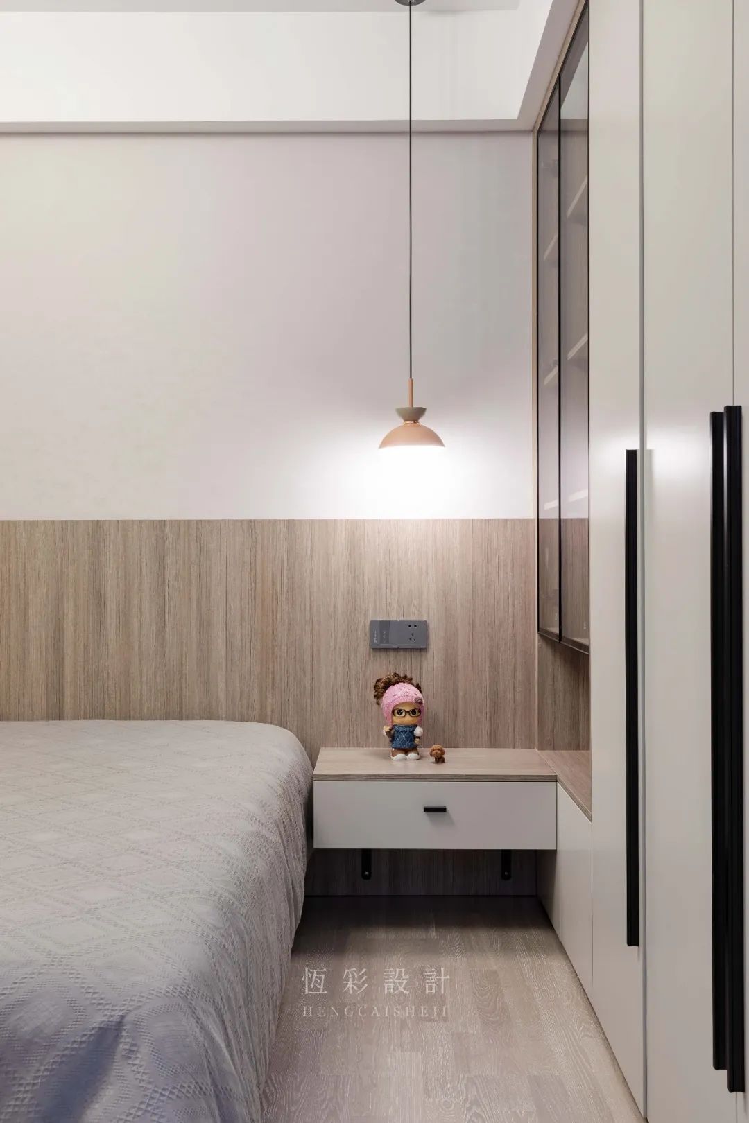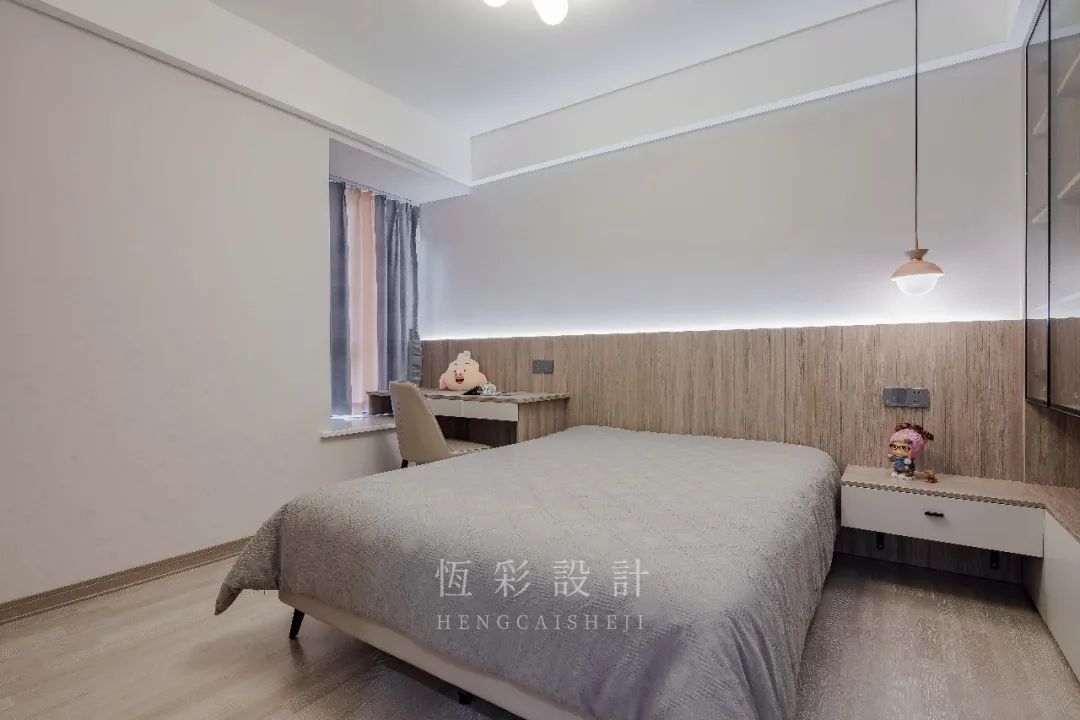 次卧做儿童房,衣柜做转角延伸代替床头柜承担置物之需,细节设计满分。