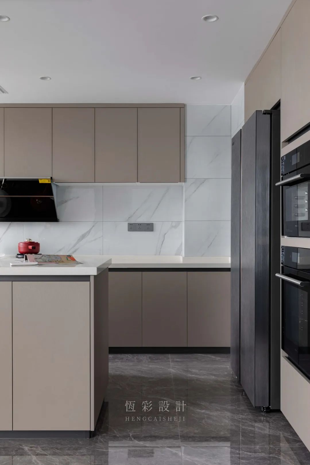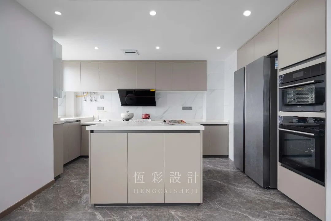 依旧是无主灯的设计,呼应客餐厅。L型台面布局,优化烹饪动线。