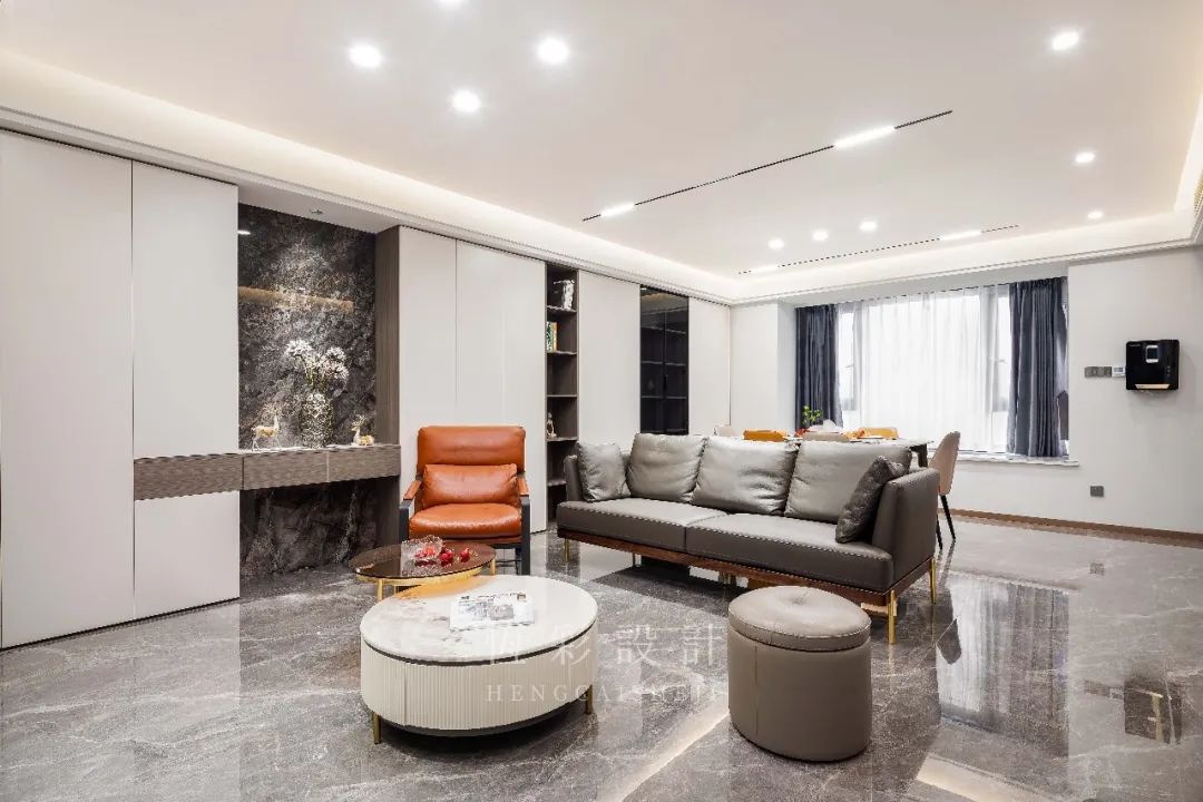 磁吸轨道灯+嵌入式筒灯+灯带的无主灯布局,提升光感的同时,空间更为时尚、大气。
