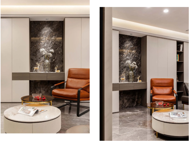 特别是以石材铺底的台面区,造型玻璃花瓶与梅花鹿摆件的放置,轻奢加持,也充分展现屋主的审美。