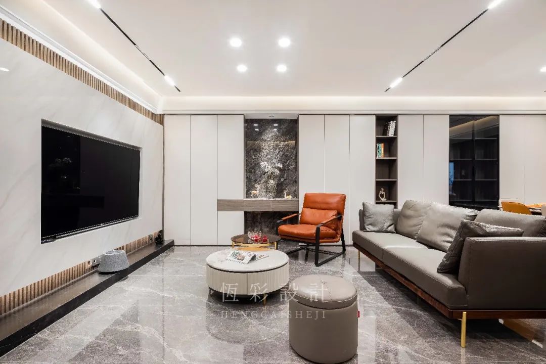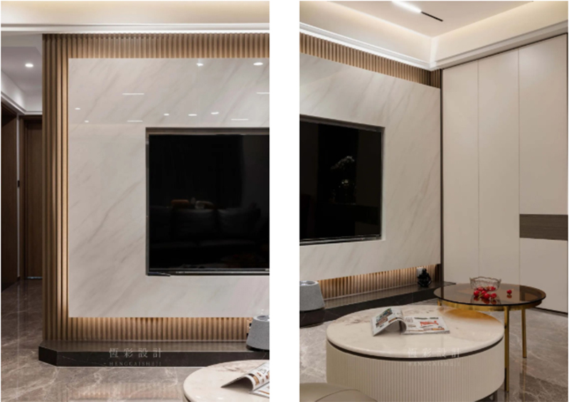电视背景墙的设计颇具亮点。以木格栅做底,电视机内嵌于一整面的大理石内部,配合灯光带的氛围营造,视觉效果、整体感超强。