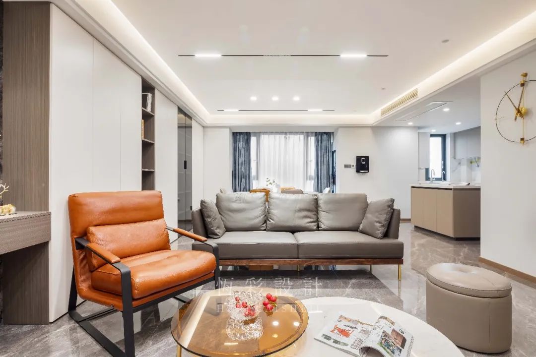 灰调皮质沙发,造型极致简洁,气质低调,将一侧的橙调皮质单人椅凸显得愈发活泼生动,在光线的漫射下光感俱佳。