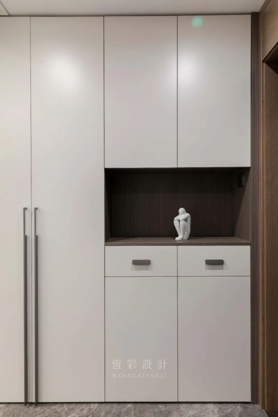 两个抽屉的设计收纳多样化,鞋柜用于收纳,保留进门的整洁度,线性把手设计感立显。