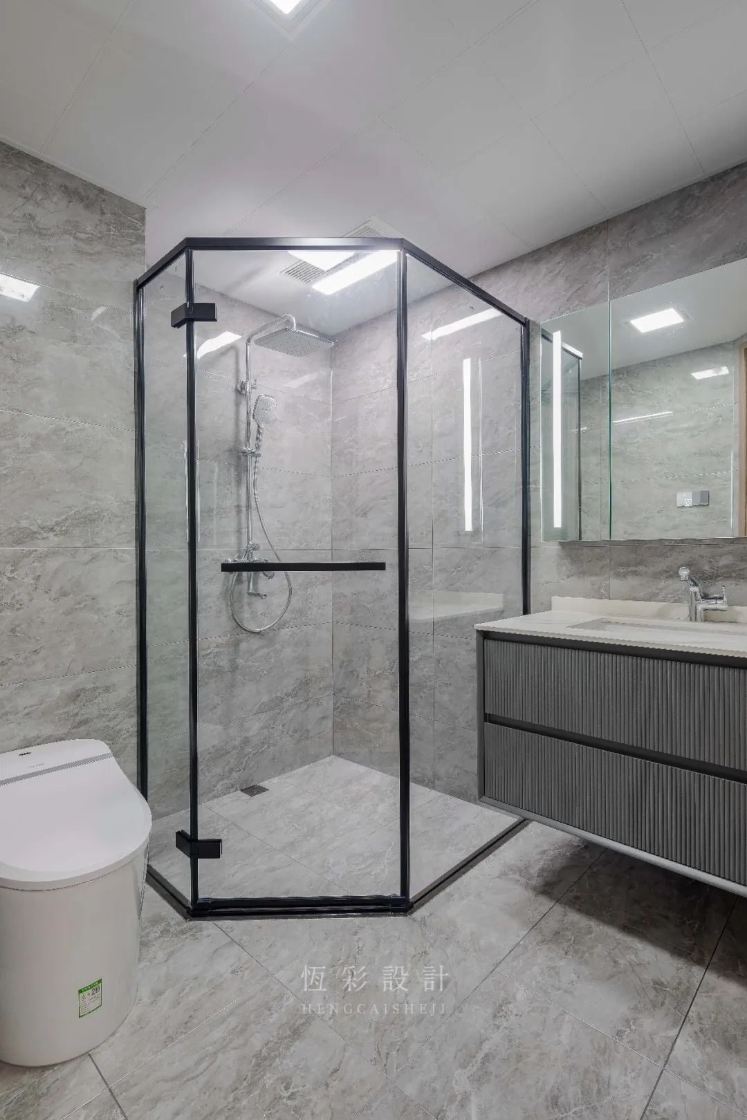 一体式布局,淋浴房相对空间做了同比缩小,黑色线框提升时尚度。