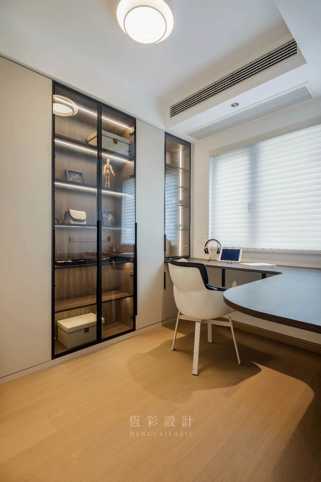 书柜的设计采用木板与玻璃门相间的形式,可极大地提升美观性。玻璃开门能清楚观察到内里,配合灯光带照明,展示效果超强。