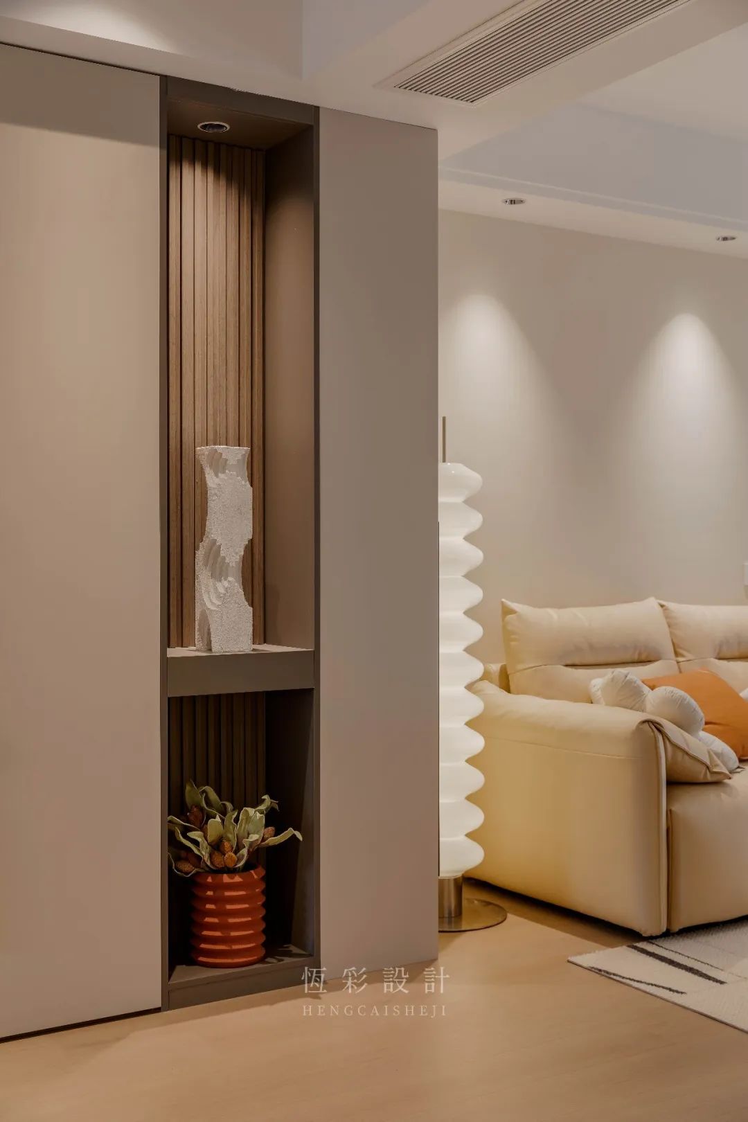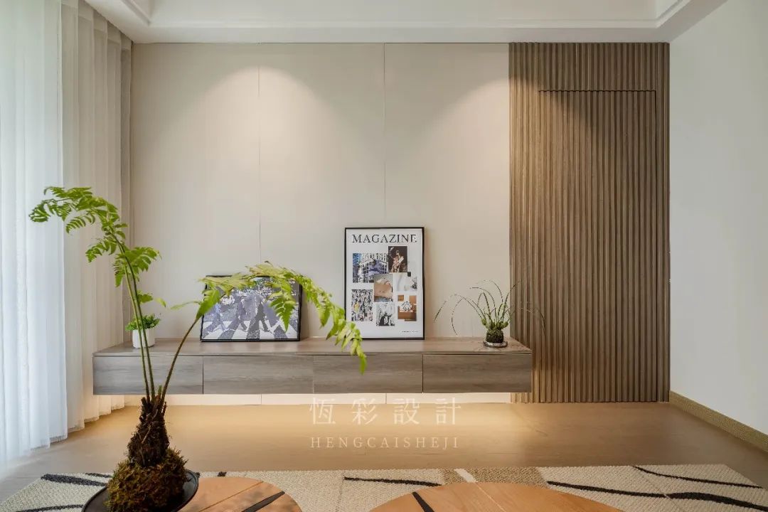 电视机背景墙的设计简洁明了,壁挂的电视机柜承担起收纳、置物之能。斜靠两幅装饰画,增添几许时尚感。纯色调背景墙,后期可投影实现客厅的娱乐性。背景墙的设计点在于单侧通往次卧的隐形门,木格栅作为装饰本就自带线性纹理质感,于中辟出隐藏式门洞,更觉别有洞天。
