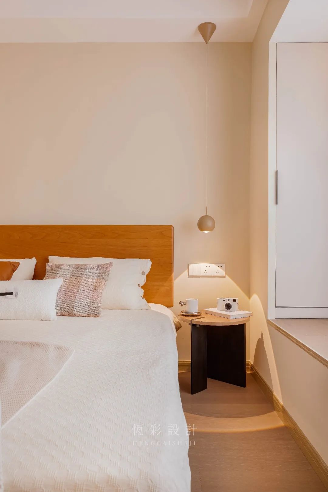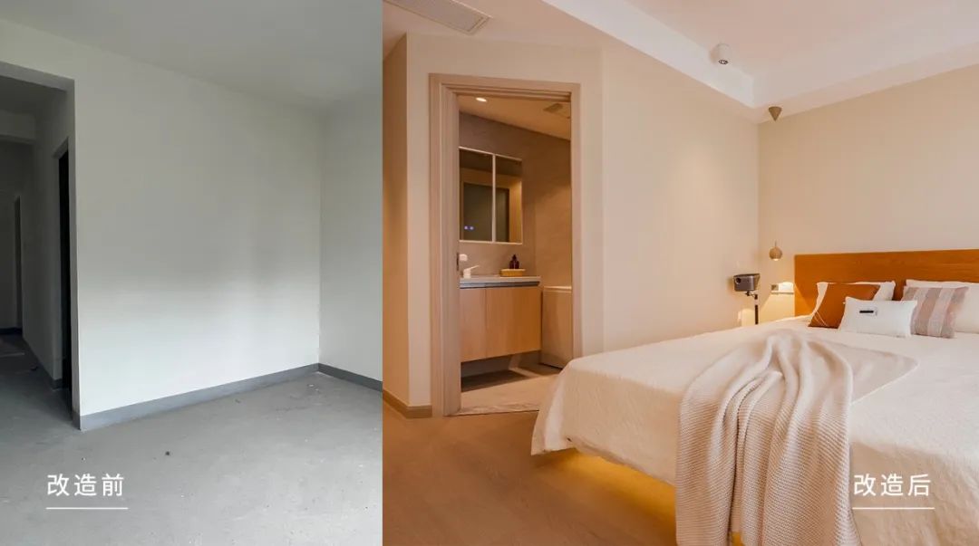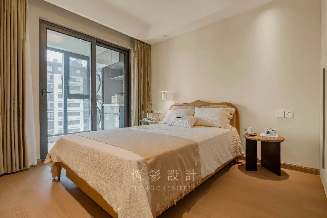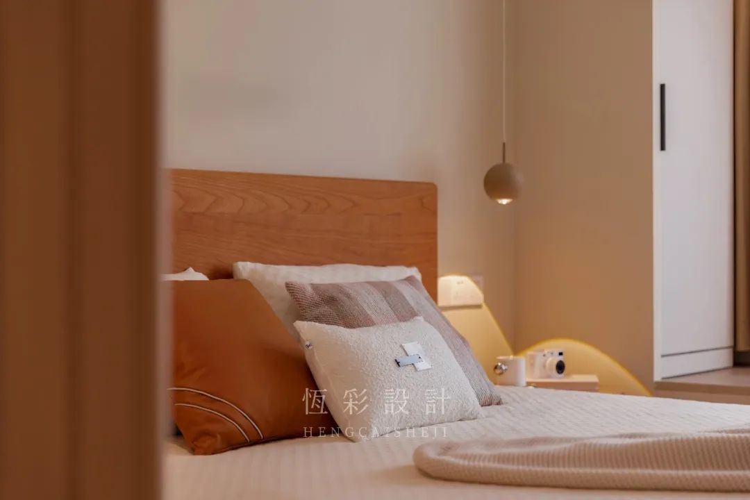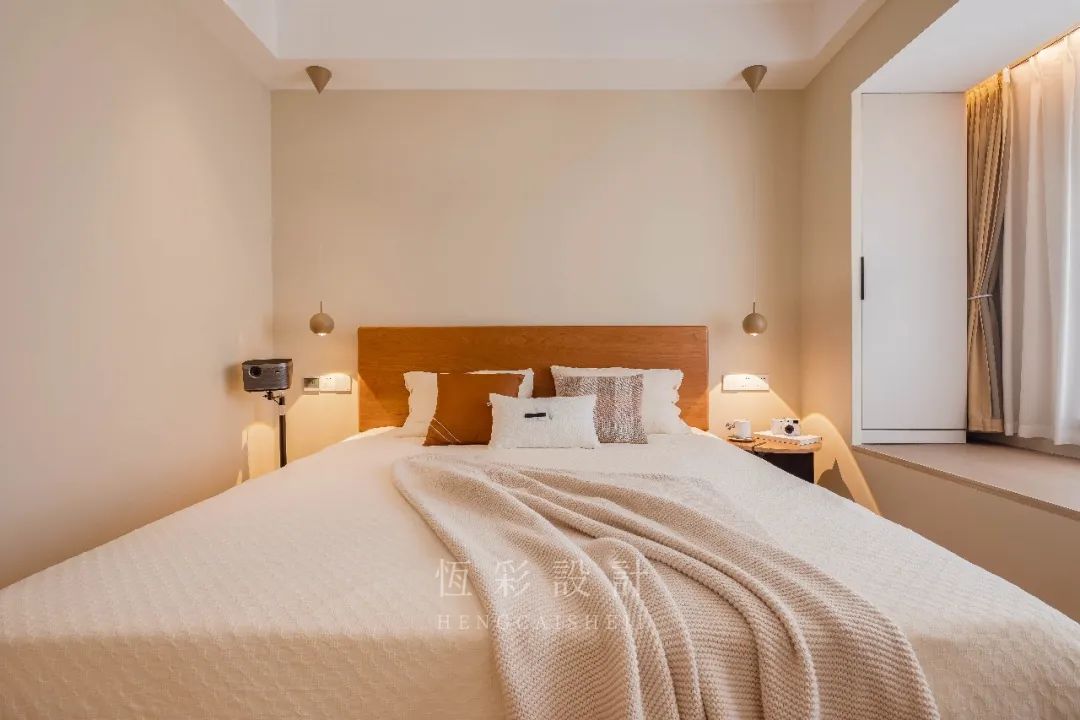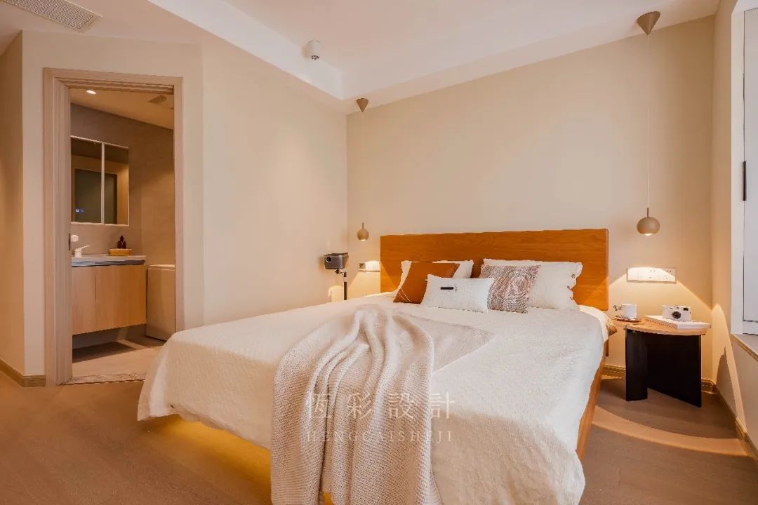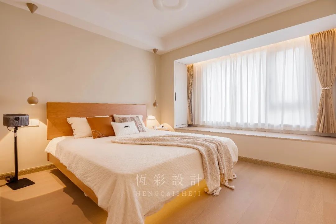 主卧整体是原木+白的清新配色,与风格调性相契合。全屋木地板通铺,配合低饱和的暖调背景墙漆,温和特质延续。