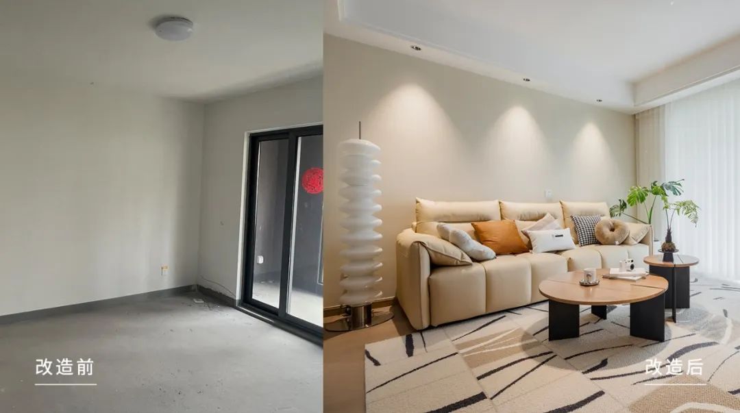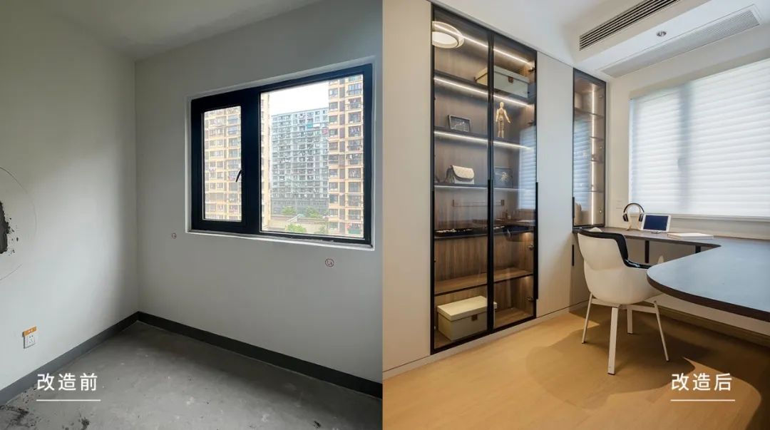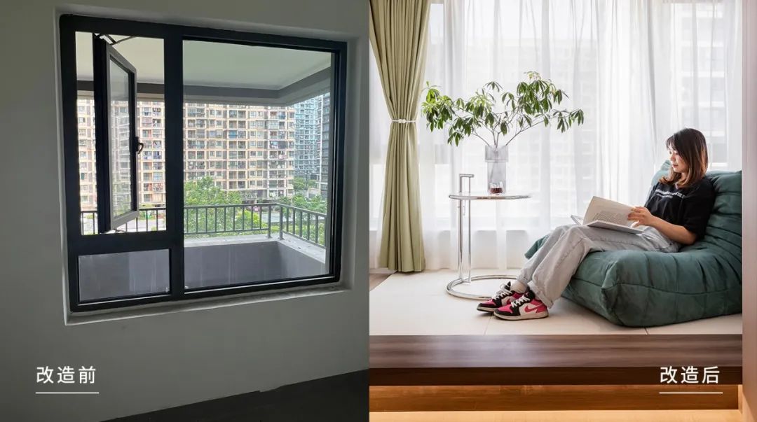 休闲区是将原来的小房间墙体拆除,向外做了拓展,封窗做闭合空间后,空间面积扩大。