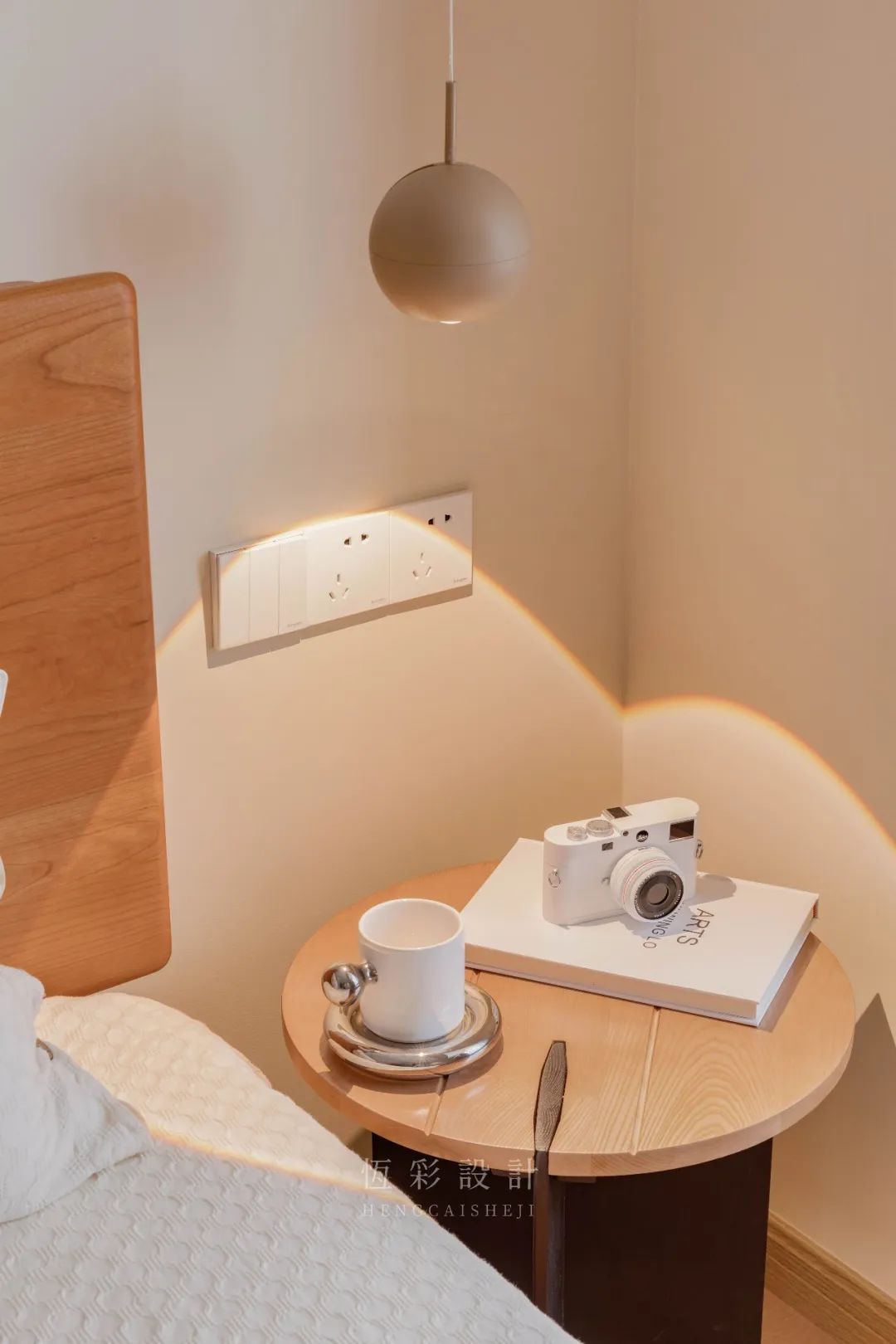 床头灯对称布局,单侧为床头柜做置物所需,另一侧放置[极米]投影仪落地,家庭影院功能get。