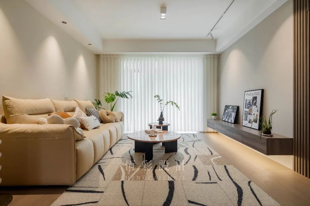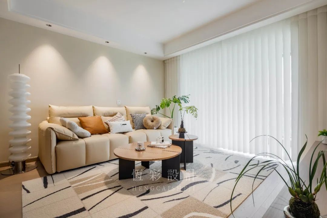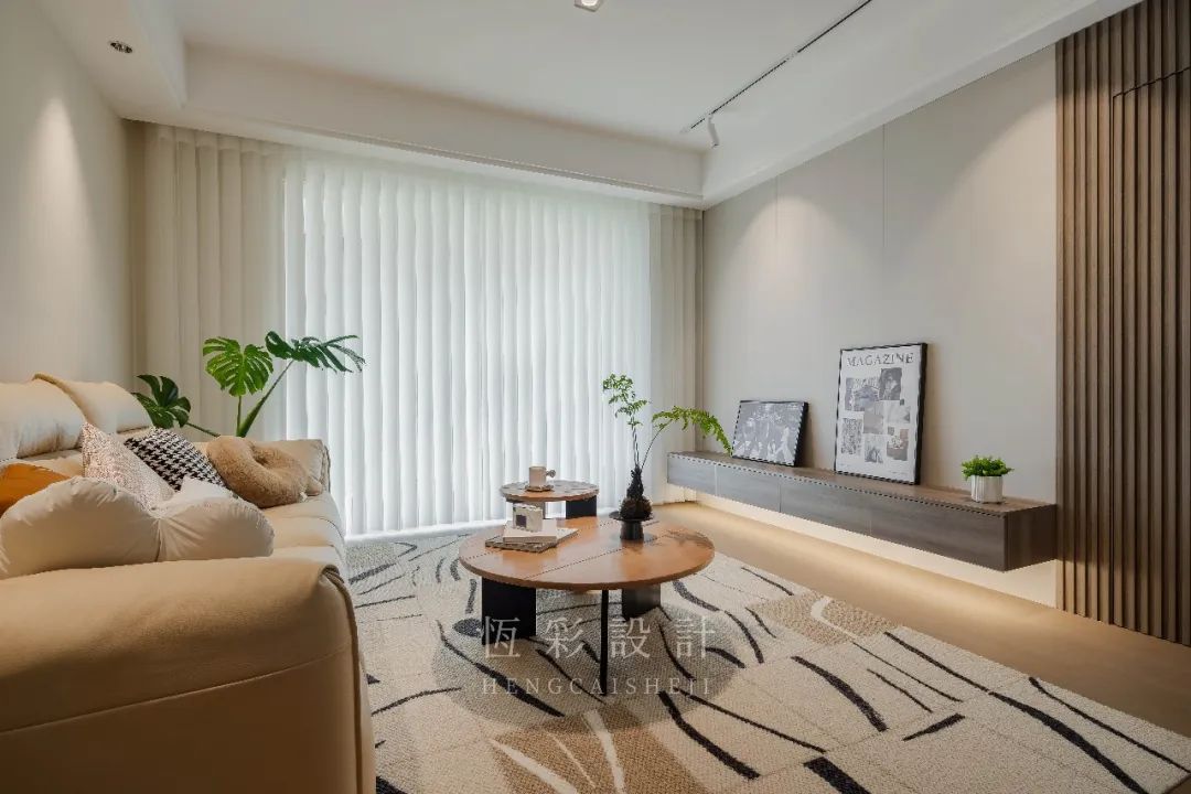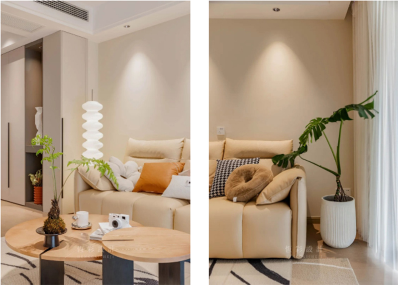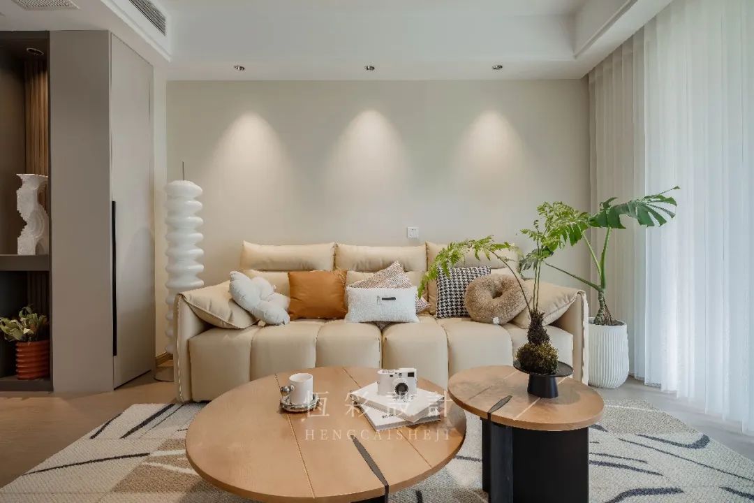 抽象的地毯、木制组合茶几,两者的配合已然简约,而绿植的出镜更添几分生趣儿,传递出的格调,也是日系原木风所独有的治愈系温柔。