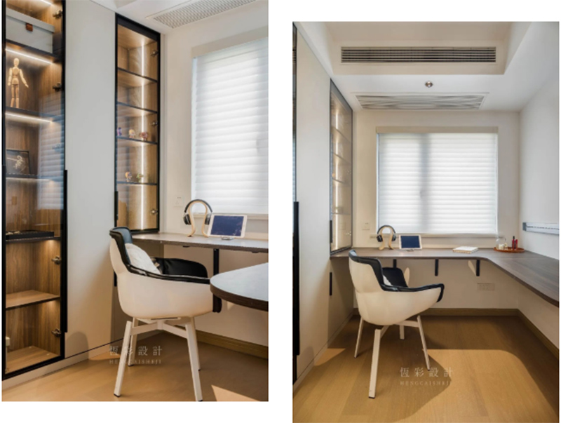 书房面积仅6.8㎡,于是利用纵向的空间,两边做柜体,靠窗设计转角办公区,空间得到完全利用。