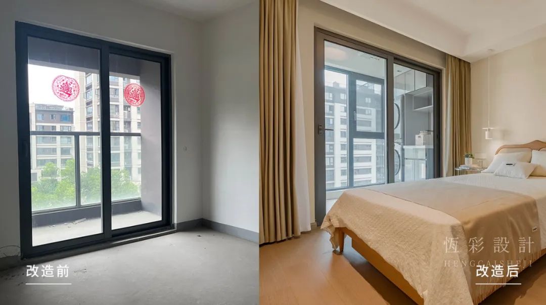 次卧格局不变,保留原本的落地移门,方便进出。空间布局以实用性为主,床+衣柜以及不对称的造型床头柜,满足基本的休息需求。