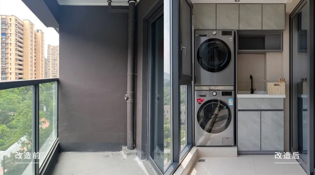 生活区增加地台抬高设计,叠放[LG]洗衣机、烘干机的同时也让旁边的水槽区空间更大,上下留空部分则做柜体填充,实用性满分。