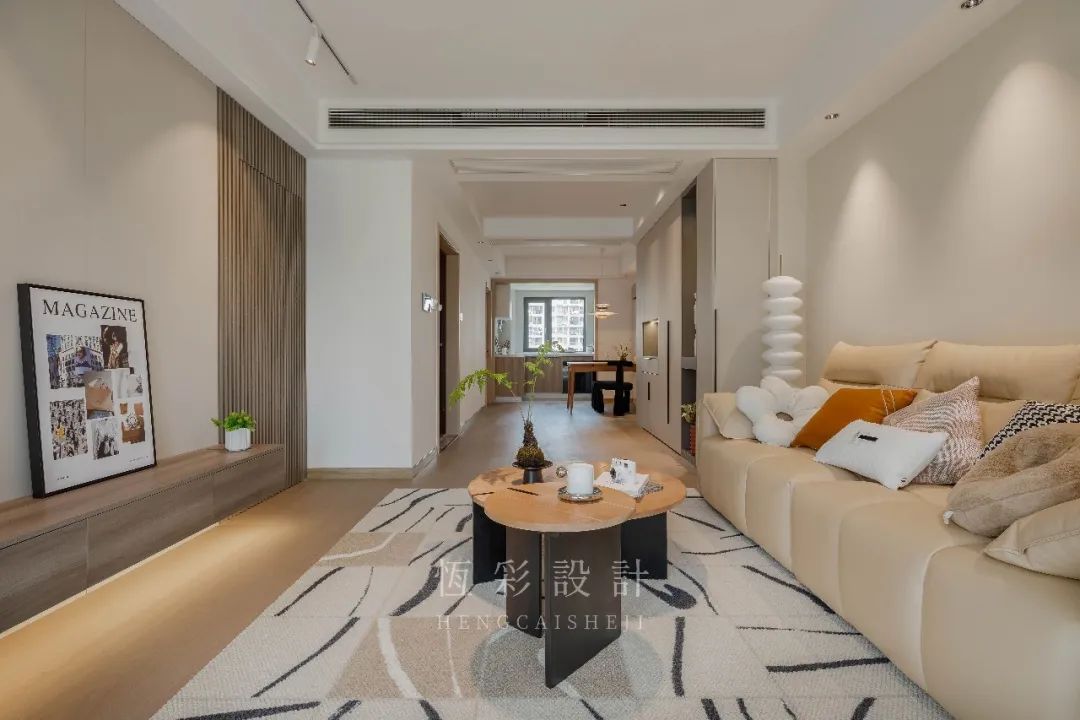 客餐厅纵深约13m,南北贯通一气呵成。两端提供采光,实现空间的光线互动。