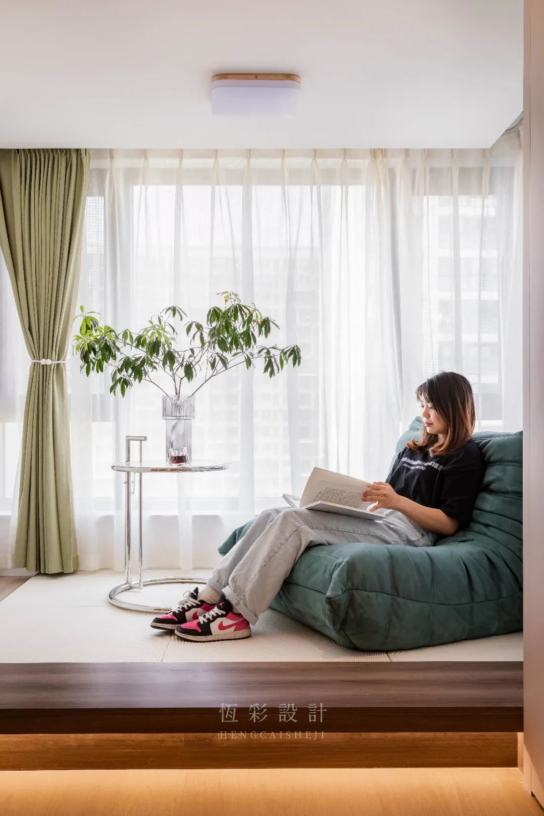 休息区分为两个部分:靠窗设计为抬高的日式榻榻米形式,储物的同时也兼具了休闲娱乐功能;靠客卫的转角区沿墙做柜体设计,承担收纳功能。