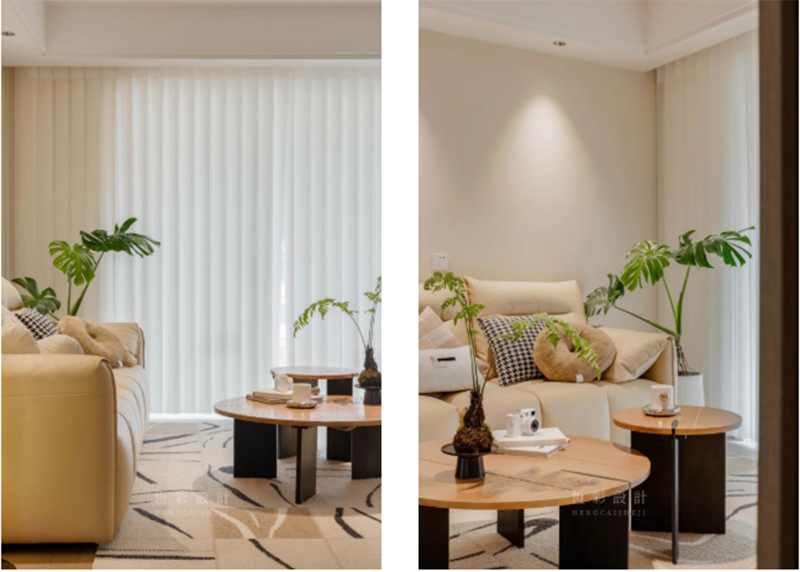 以木地板平铺,配合奶油调的三人位沙发,是触眼可及的温润。选择几近落地的白纱作为客厅、阳台的软隔断,秩序的褶皱犹如风琴键一般,随风摆动悠扬、婉约。
