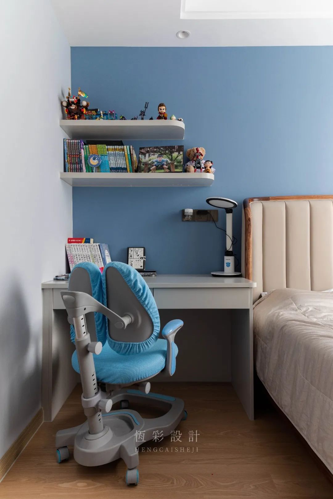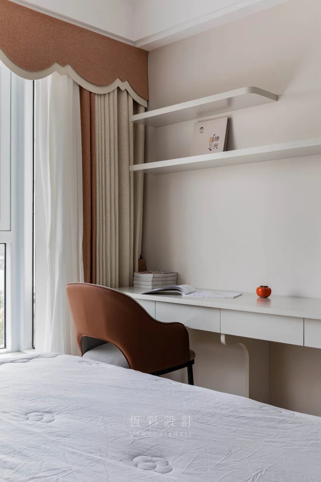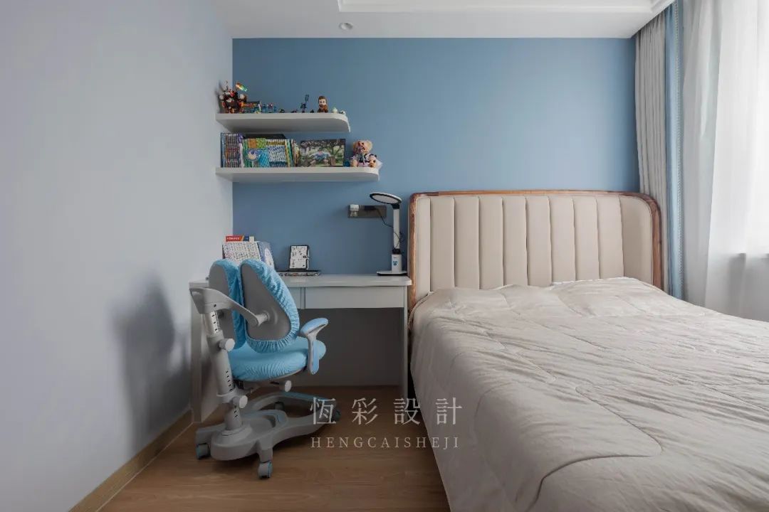 床尾定制书桌+置物隔板,简单的布局,更凸显设计本身的功能性。