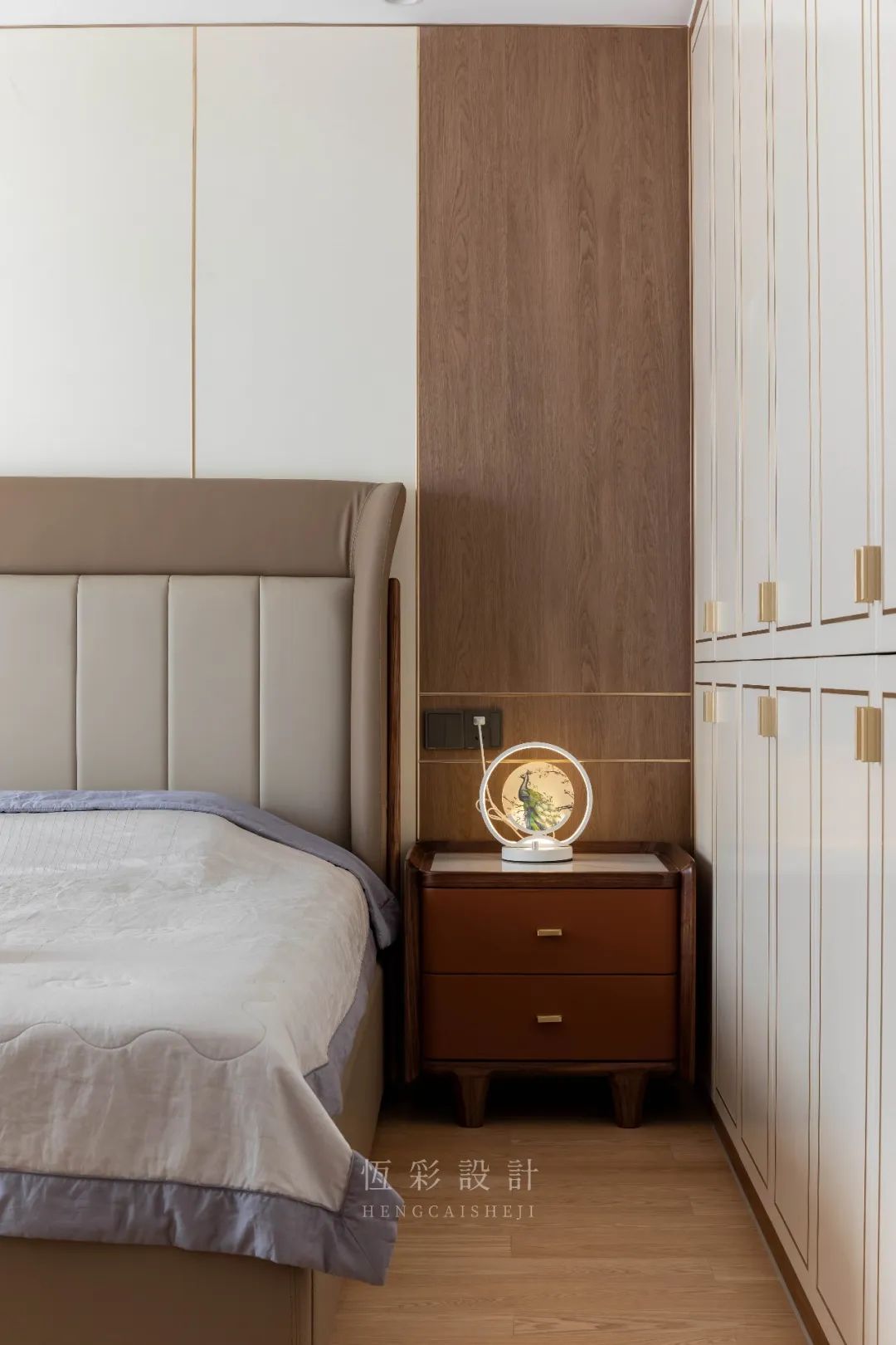 有趣的是床头灯的选择,不开灯时可作为简单的装饰品,夜间亮灯则满是中式的意境,温暖的光线让身心都有了归属感。