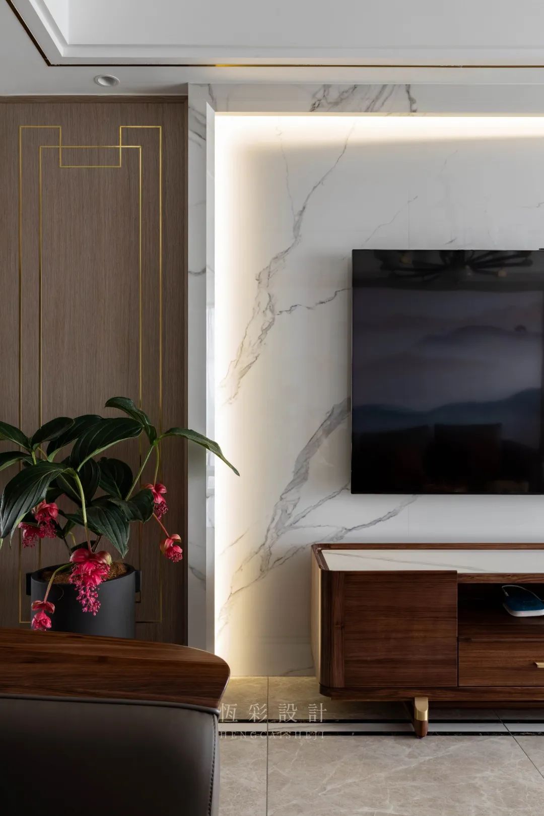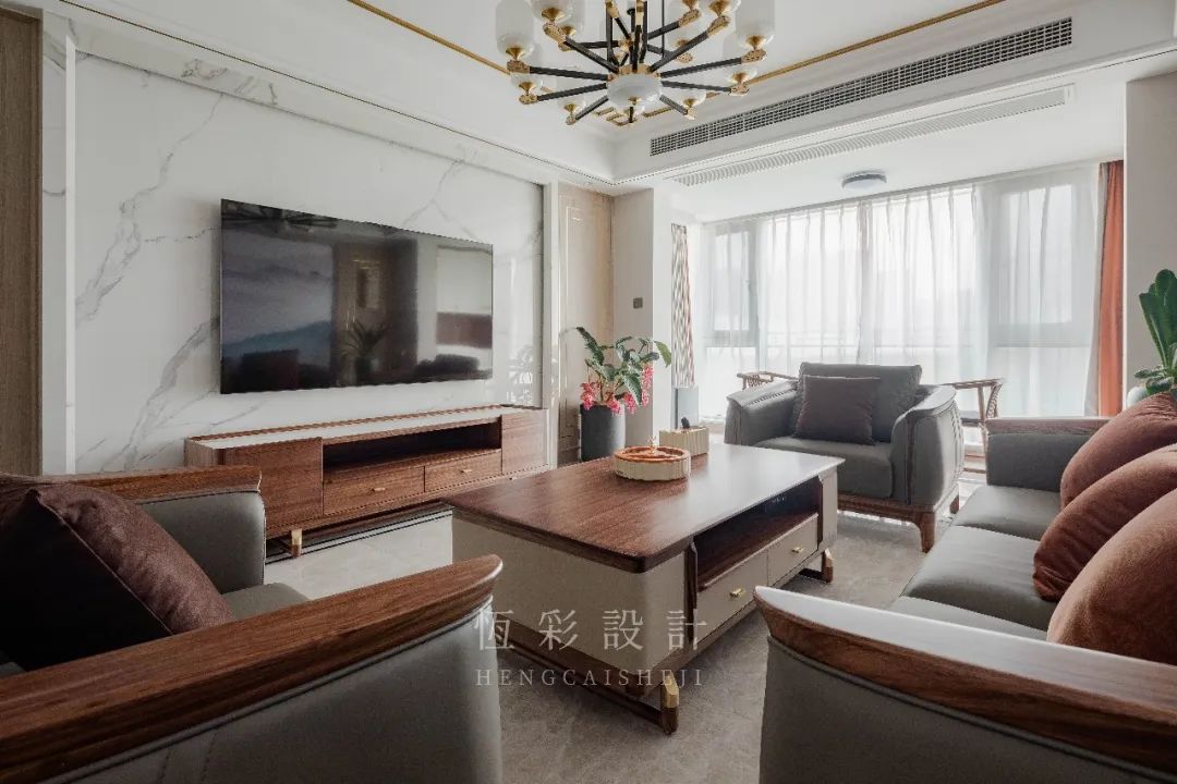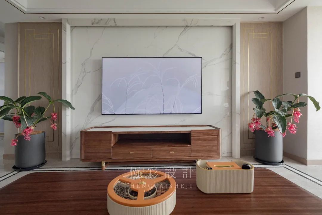 电视机背景墙则以正面的大理石砖上墙,内嵌灯带,做出层次的立体感。背景墙的设计颇为简洁,延续中式极致的对称设计。