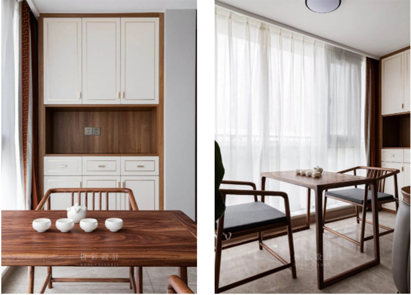一端靠墙做柜体设计,可用于置物。摆放一张方桌、两把椅子,休闲、雅致意味自来。