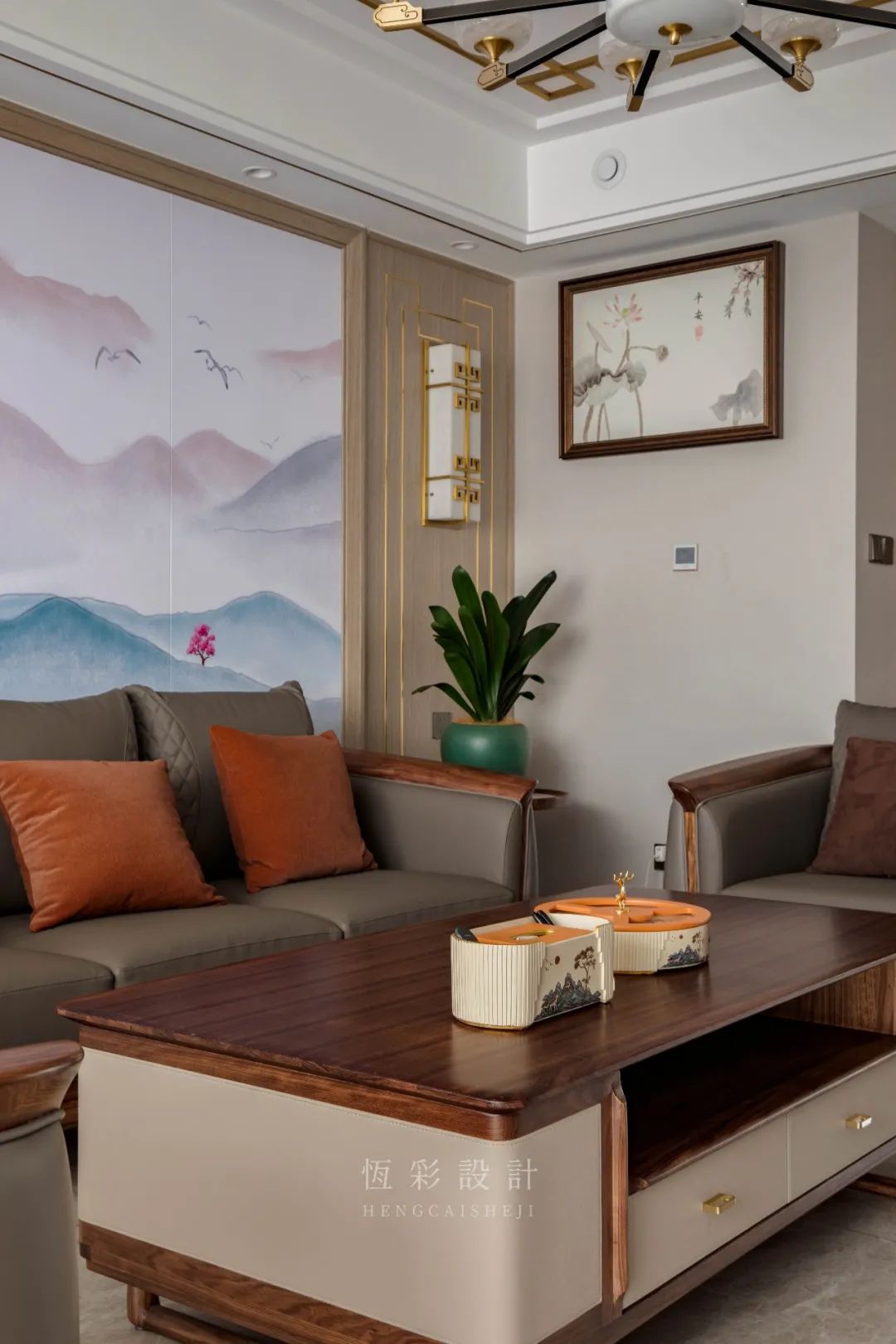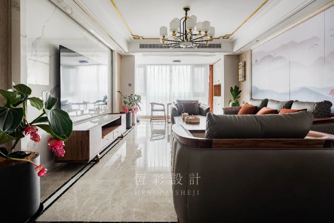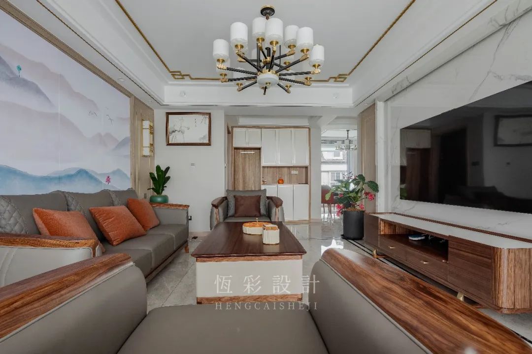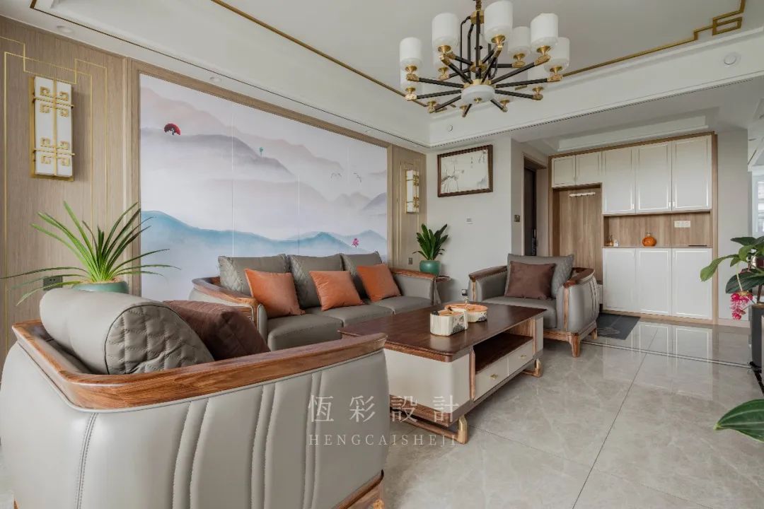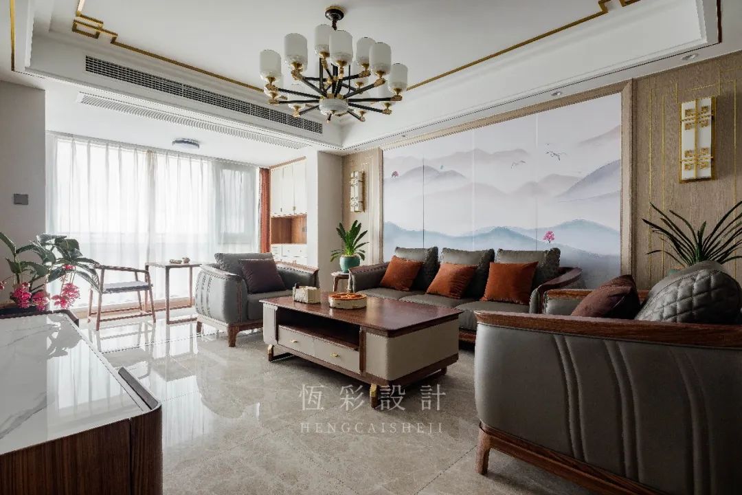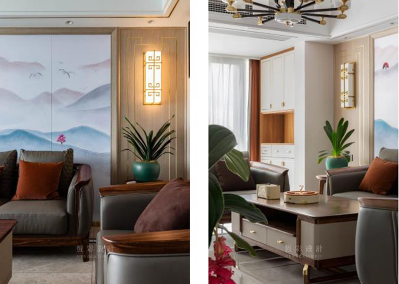 沙发背景墙做山水硬包,同时左右两边对称,木饰面以金属线条元素做出造型,中式风点睛。