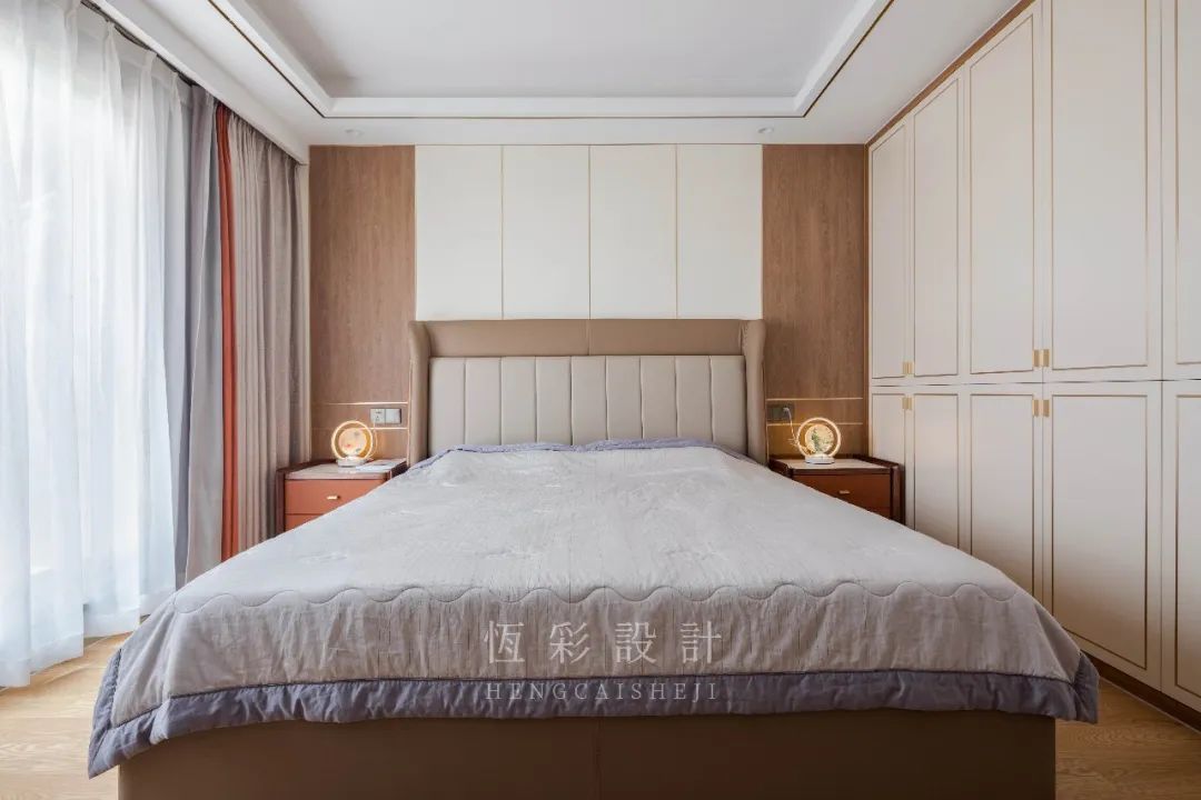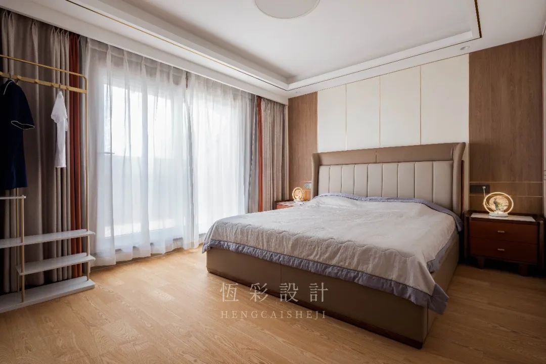 主卧与大露台以移门相隔,提升空间采光,两层窗帘设计,白纱保证光线和隐私性,撞色窗帘遮光、隔音。