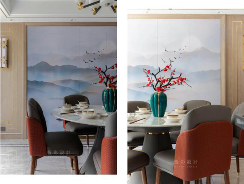 依旧是山水画的硬包墙面,与客厅形成空间艺术感的呼应,两端木饰面的对称式布局,格调高雅,造型简朴而优雅。