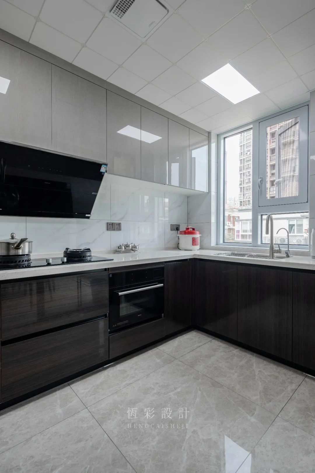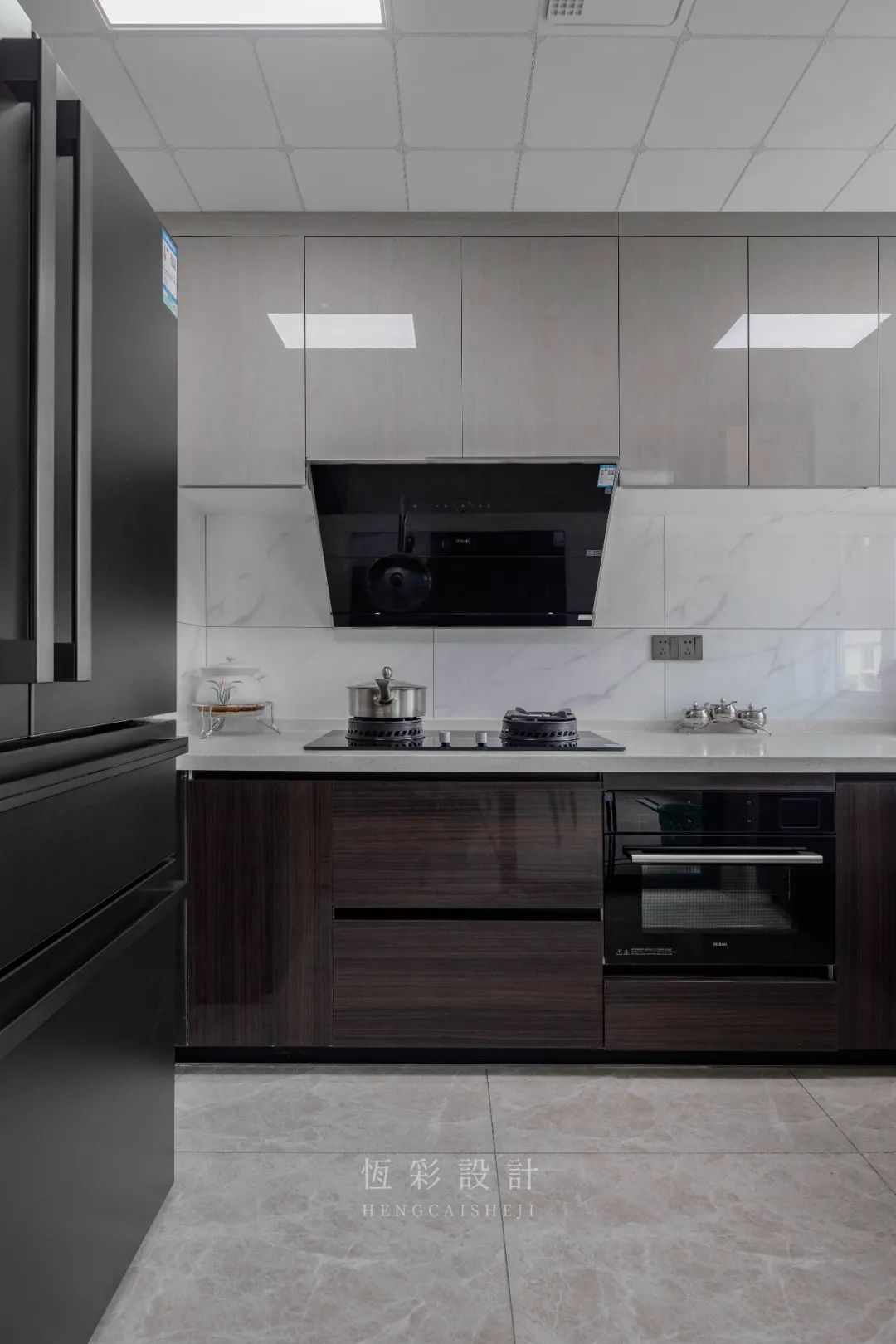 U字型台面将7.7㎡的空间最大化利用起来,选择浅调的墙/地砖,尽可能提升空间光感。[老板]蒸烤箱嵌于深色橱柜内,保留空间的整洁度;双开冰箱立于靠移门一段,方便物品的拿取。