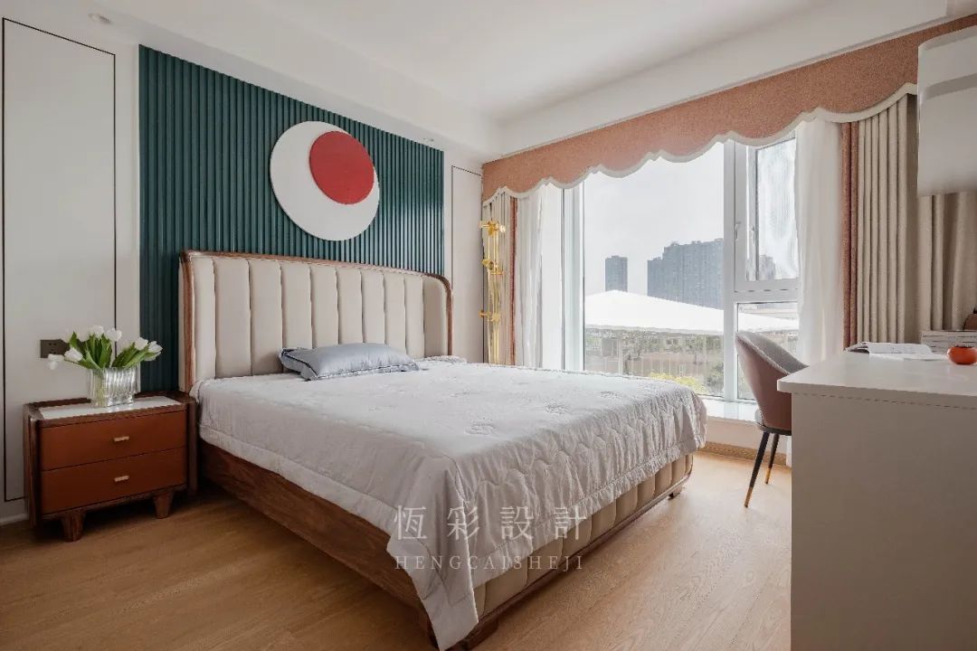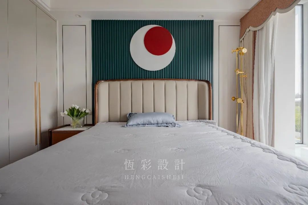 整体用色温柔,床头背景墙选择以格栅做出林立效果,拉伸纵向空间。背景装饰画,红与白的极致对比,创意而有个性,亦是祥和、宁静的视觉美学。
